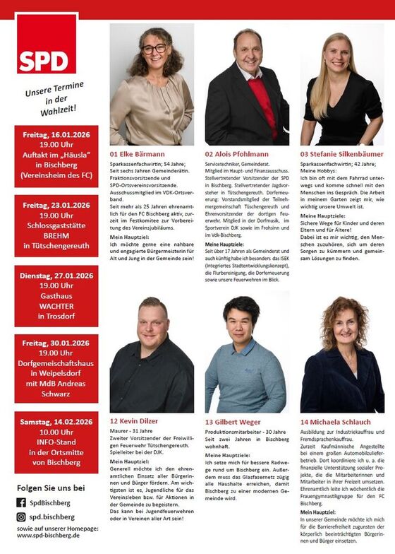 Die Bischberger Sozialdemokraten haben ihrer Kandidatin Elke Bärmann insgesamt weitere 21 Unterstützerinnen und Mitstreiter an die Seite gestellt, um die Kommunalwahl 2026 erfolgreich zu gestalten. Sieben aktive Frauen stehen auf der breit aufgestellten Liste.